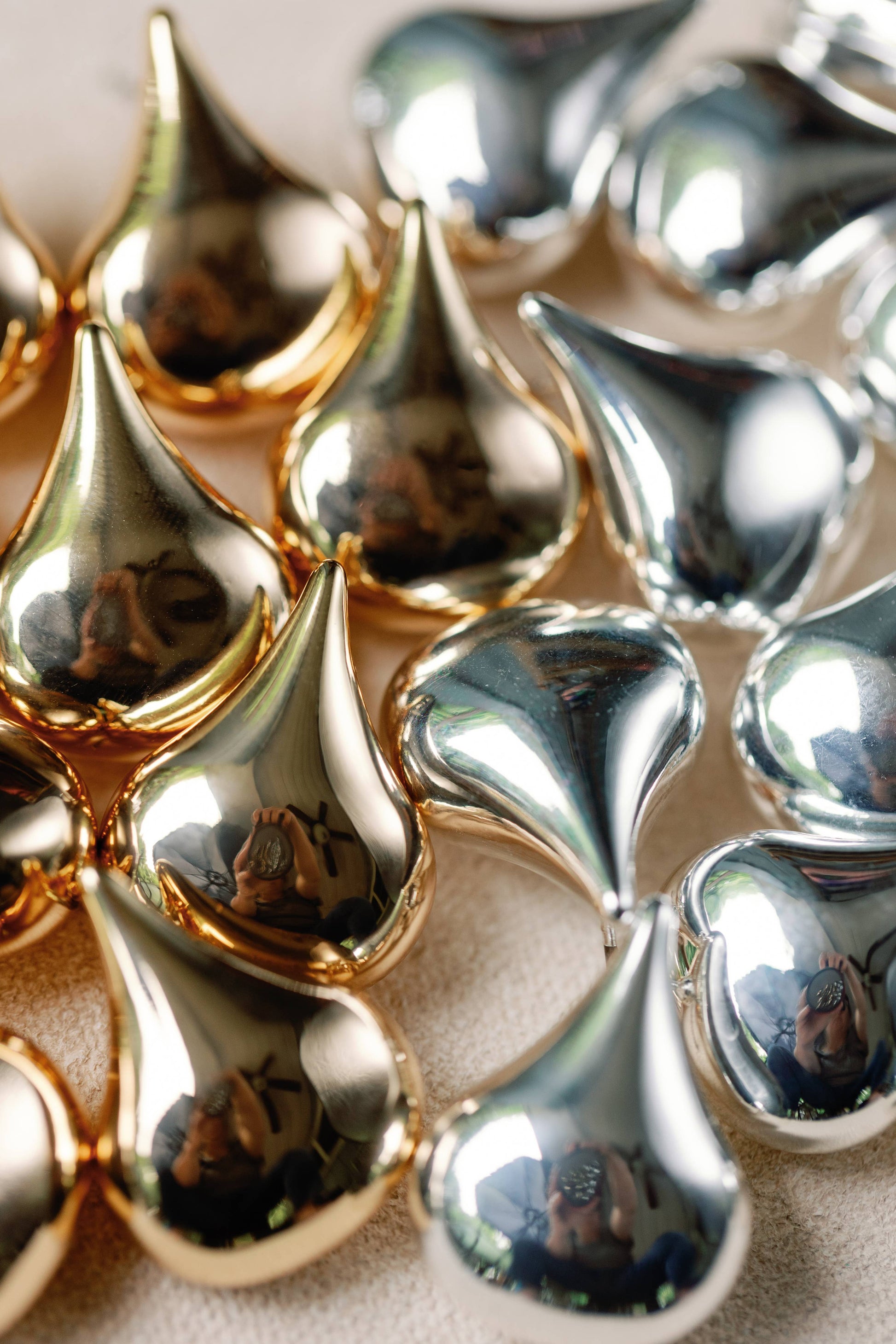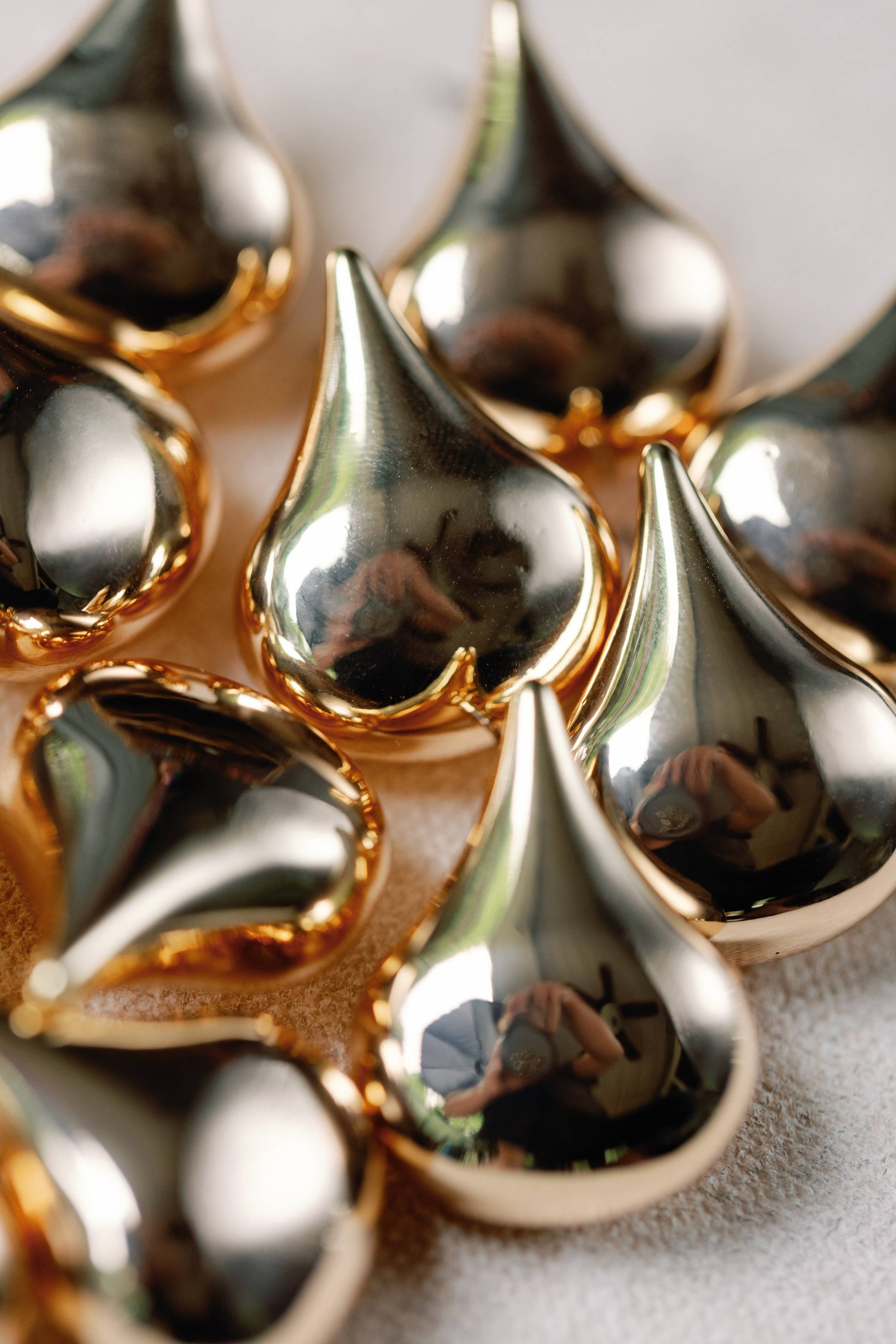 Our new chunky teardrop earrings in gold-plated brass feature a chunky base with an elongated center, adding a touch of on-trend sophistication to any outfit. Their polished finish and bold design, perfectly sized a 1”, make them a great basic for all seasons.