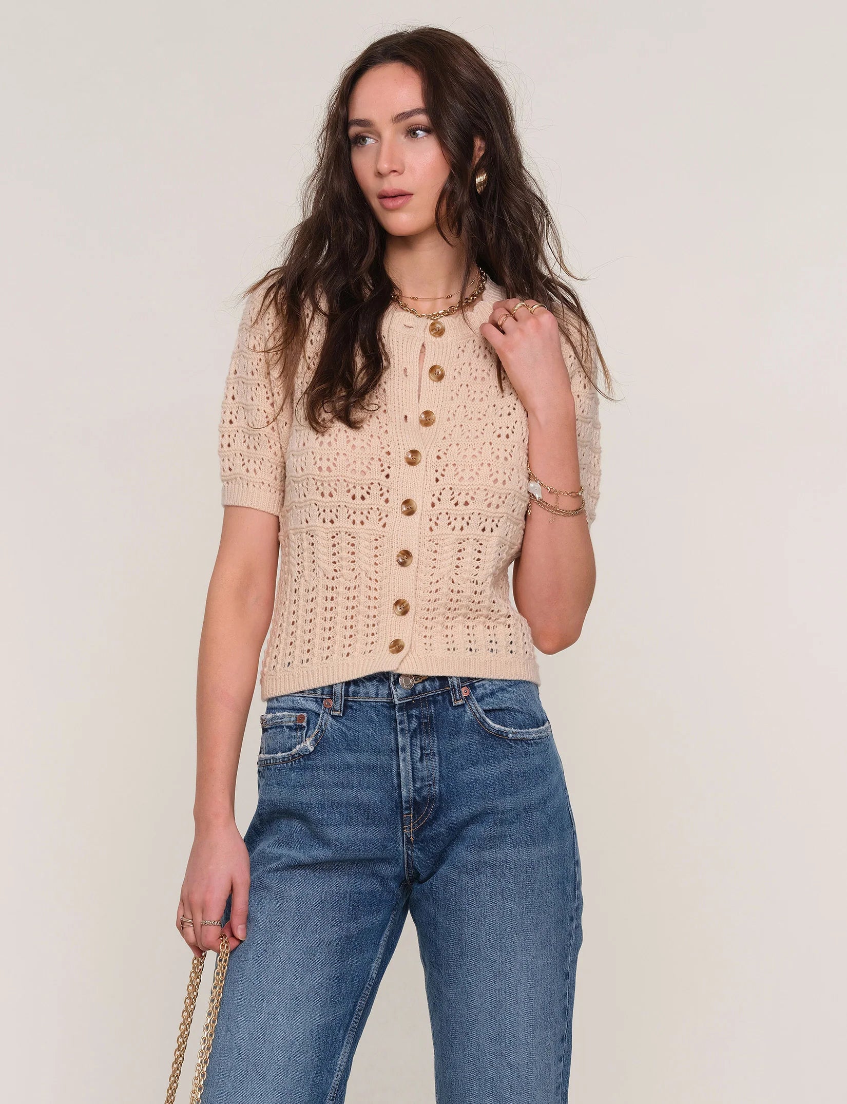 The Alicia Cardi is a crew neck knit with short sleeves. Made from a wool blend, it features a pretty, pointelle stitch throughout the body and faux horn buttons at the front.