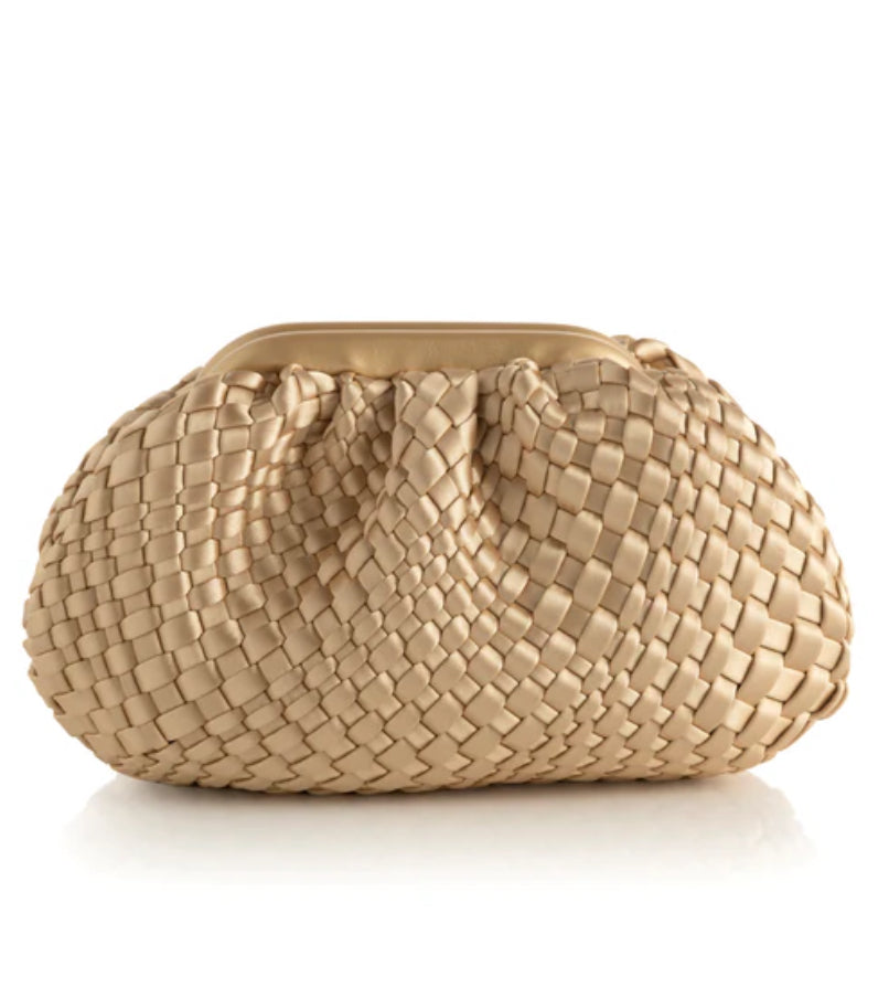 Stand out this season with the chicest new fall handbag, the Bailey Clutch. This classic clutch silhouette comes in an elegant champagne color and is elevated by its woven satin texture with a sleek, magnetic frame top closure. Just under a foot long with a roomy interior, it is the perfect size to carry all of your essentials in hand during a night out.