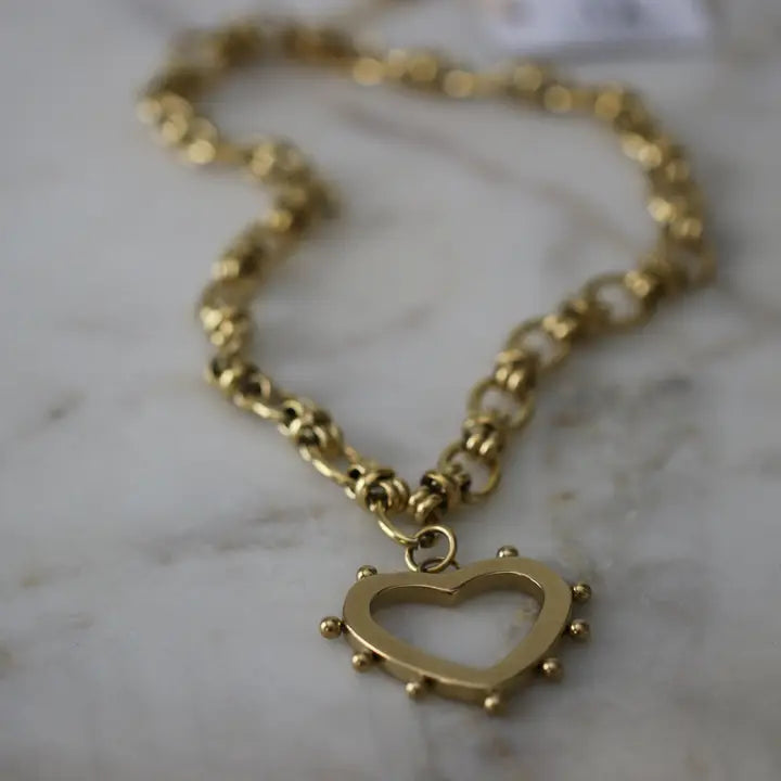 Make a powerful statement with the Bold Heartbeat Necklace, a standout piece that blends edge with charm. This necklace features a bold, open-heart pendant with playful dotted details, suspended from a wide, textured chain that adds just the right amount of drama.