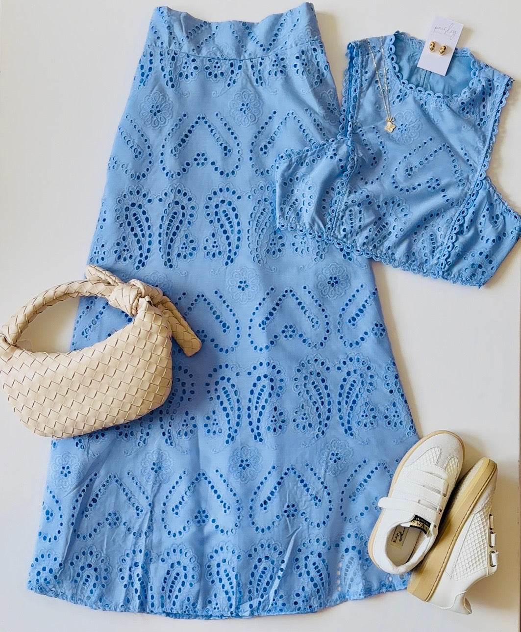 Effortlessly elevate your summer wardrobe with our Aden Eyelet Set. This stylish skirt and top set is perfect for any occasion, easily dressed up or down. The intricate eyelet design adds a touch of elegance, making it a must-have for any fashion-forward individual.