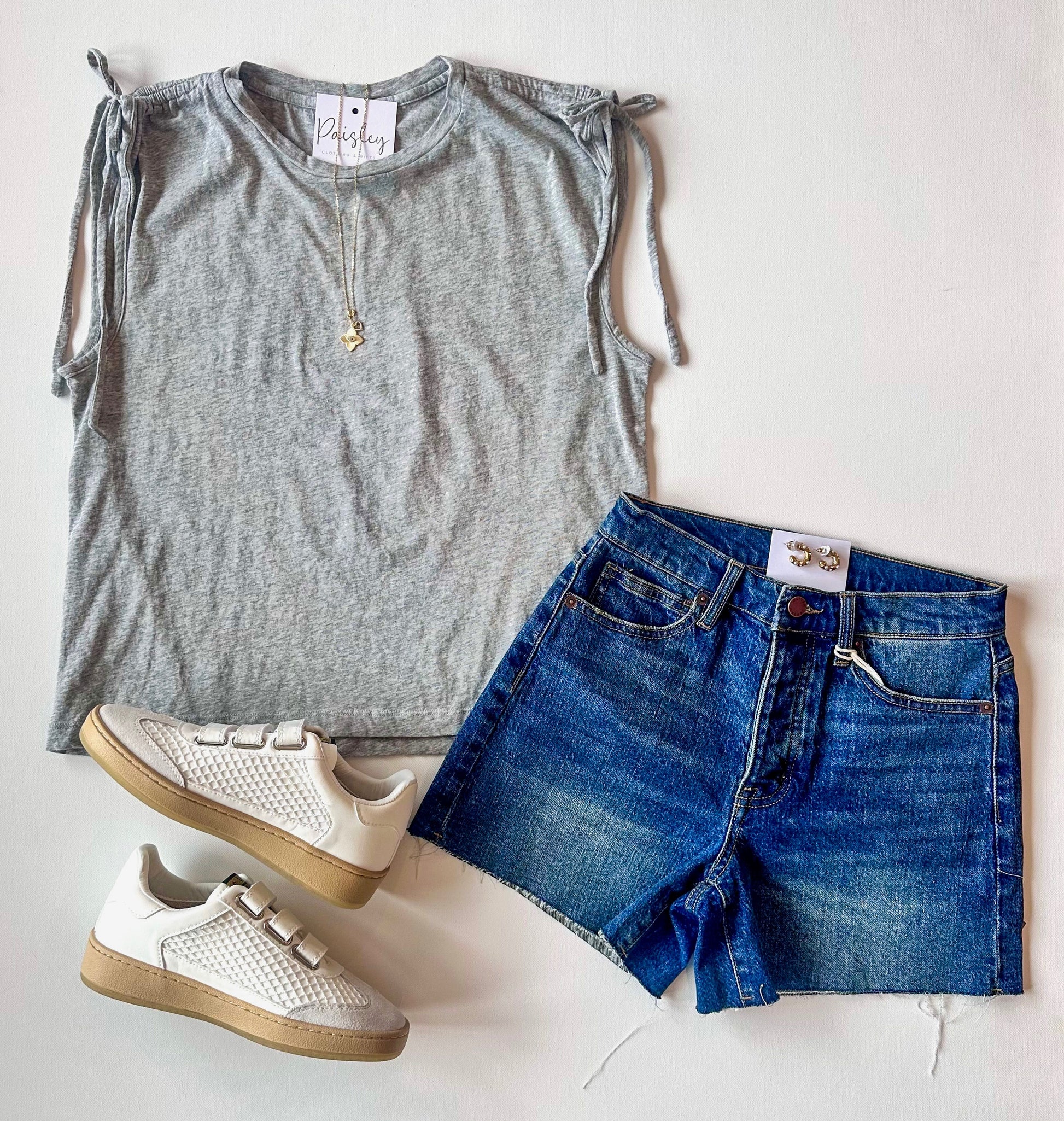 This muscle style tee comes with shirred drawstring sleeves. Easy fit and lightweight cotton.