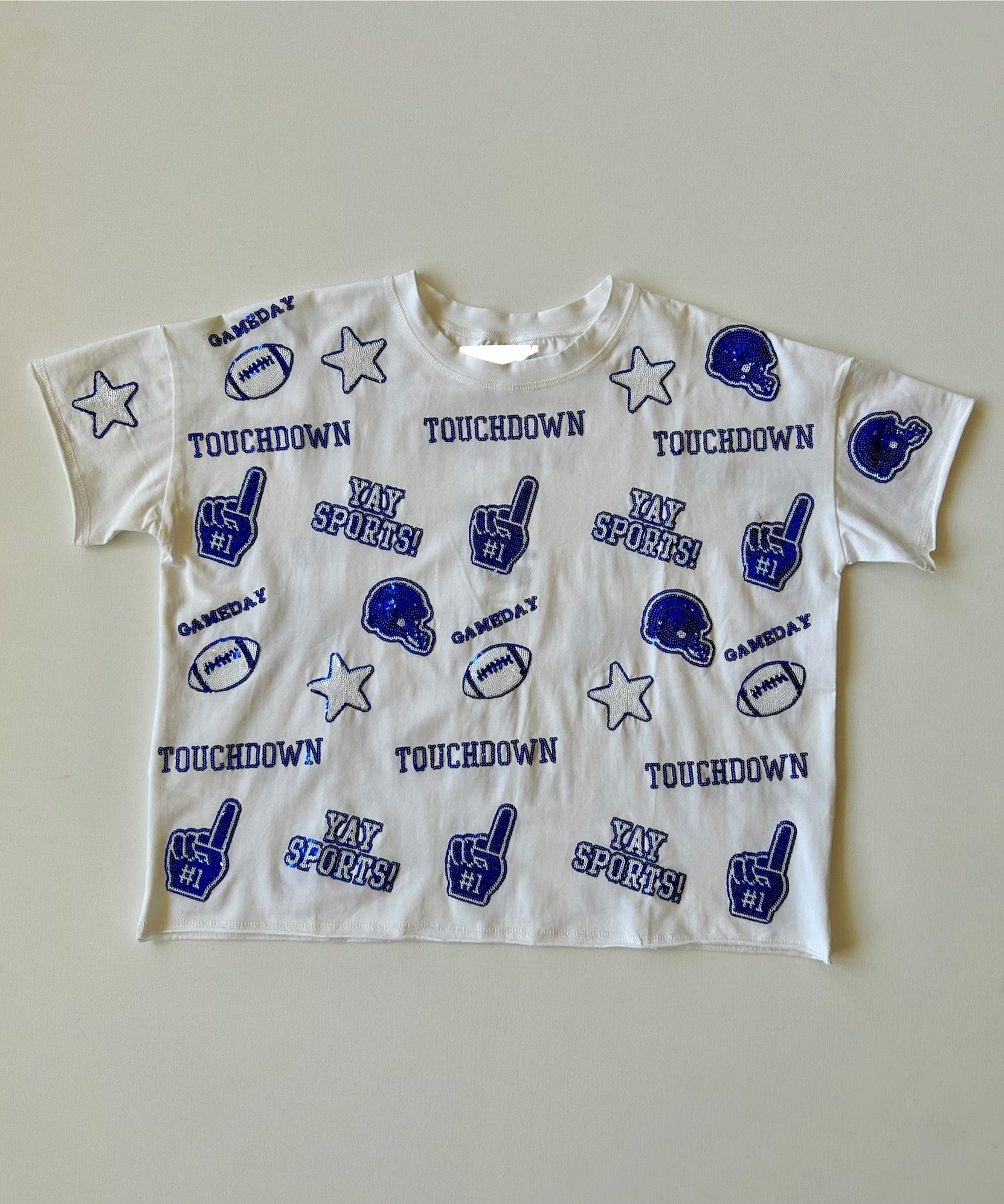 Show your team spirit with this expert-crafted Gameday Sequin Tee in royal blue and white. Featuring shimmering sequins, it adds a touch of glam to your game day outfit while keeping you comfortable. Perfect for cheering on your team in style and standing out in the crowd.