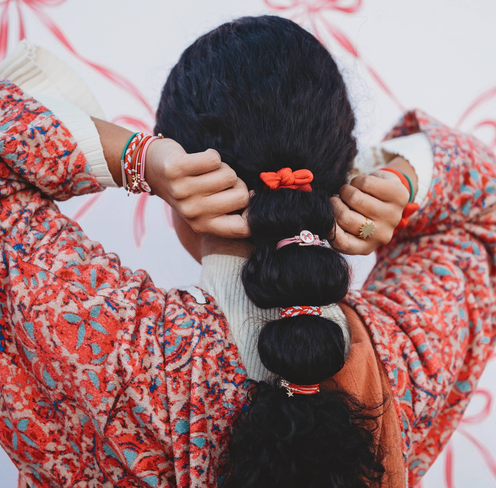 Introducing Joy – the perfect holiday hair tie bracelet! With festive colors and a subtle sparkle, Joy seamlessly transitions from wrist to hair, adding a touch of holiday magic to your style. Whether you're dressing up for a seasonal celebration or keeping it casual, Joy brings both charm and function to any outfit. Looking for a fun stocking stuffer? Joy makes a great gift, blending practicality with a festive feel. Spread the joy this season by gifting one (or a few) to friends and loved ones!