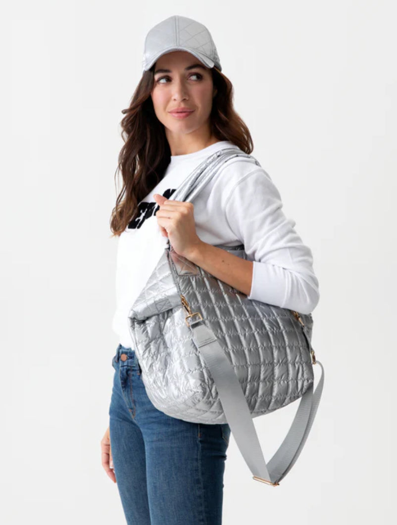 Perfect your on-the-go lifestyle with the Logan Tote. This classic and roomy tote features a sleek silver metallic fabric that goes with any outfit for an elevated yet casual look. With both double handles and a detachable, adjustable cross-body strap it is versatile enough for every occasion, and its spacious interior and multiple pockets allow you to carry everything in one place.