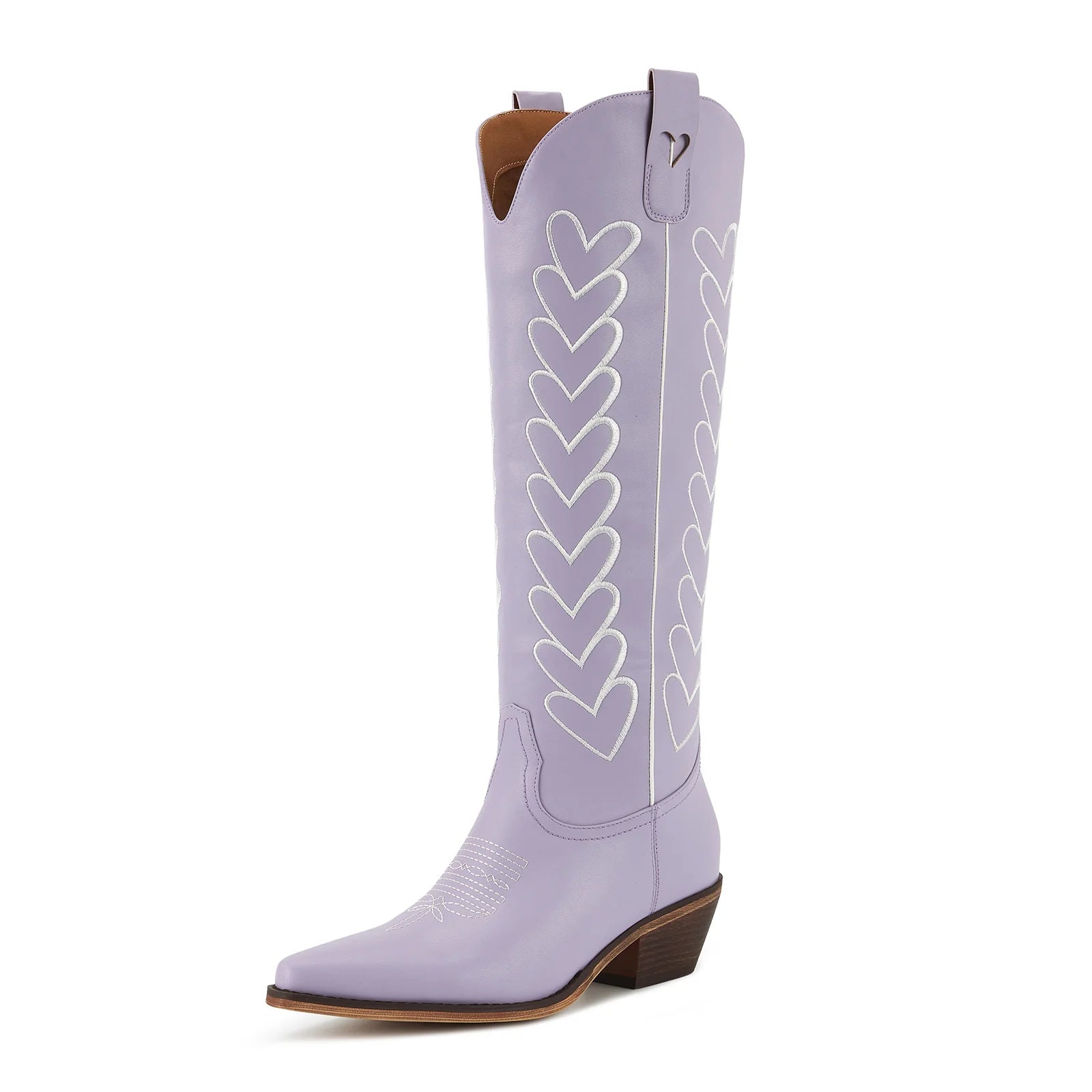 Introducing The Maybelle in Lavender - our stunning lavender boots are designed to capture hearts. They feature embroidered hearts down the sides and heart-shaped cut-outs on the top pull loops. It's perfect for music festivals, country-inspired looks, or everyday style.