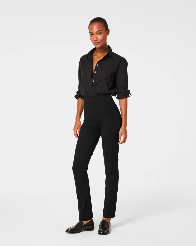 This smoothing pant comes in our premium ponte fabric with targeted compression built in, powered by SPANX CoreSure Tech™. With comfortable 4-way stretch and a high rise waist, this slim straight pant will have you feeling smooth from tummy to thigh, and oh-so-comfortable throughout the leg. No zippers, no buttons, and no pockets (so no bulk!) at the hips—all for the ultimate smoothing effect.