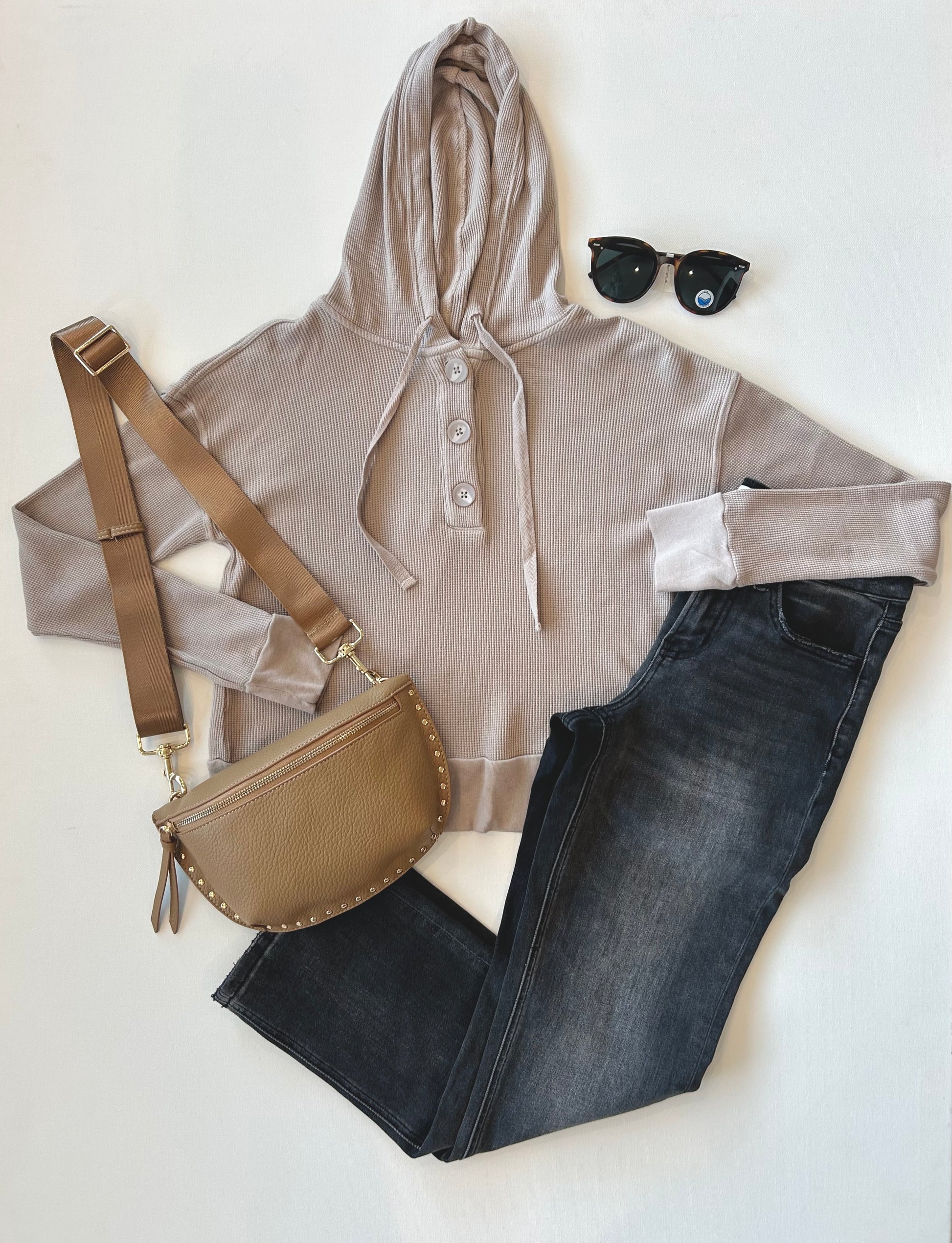 Split Neck Button Hoodie in Fossil