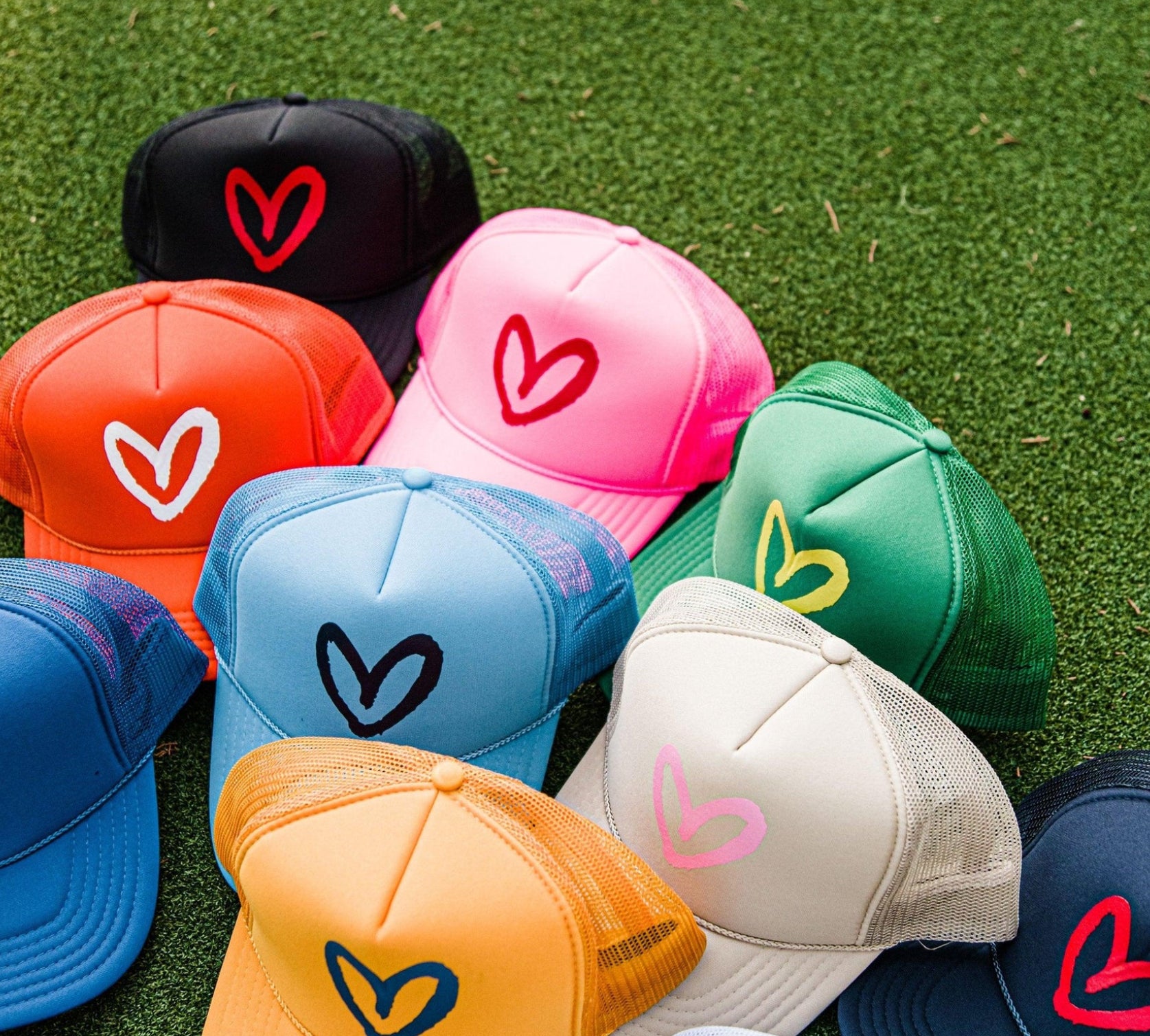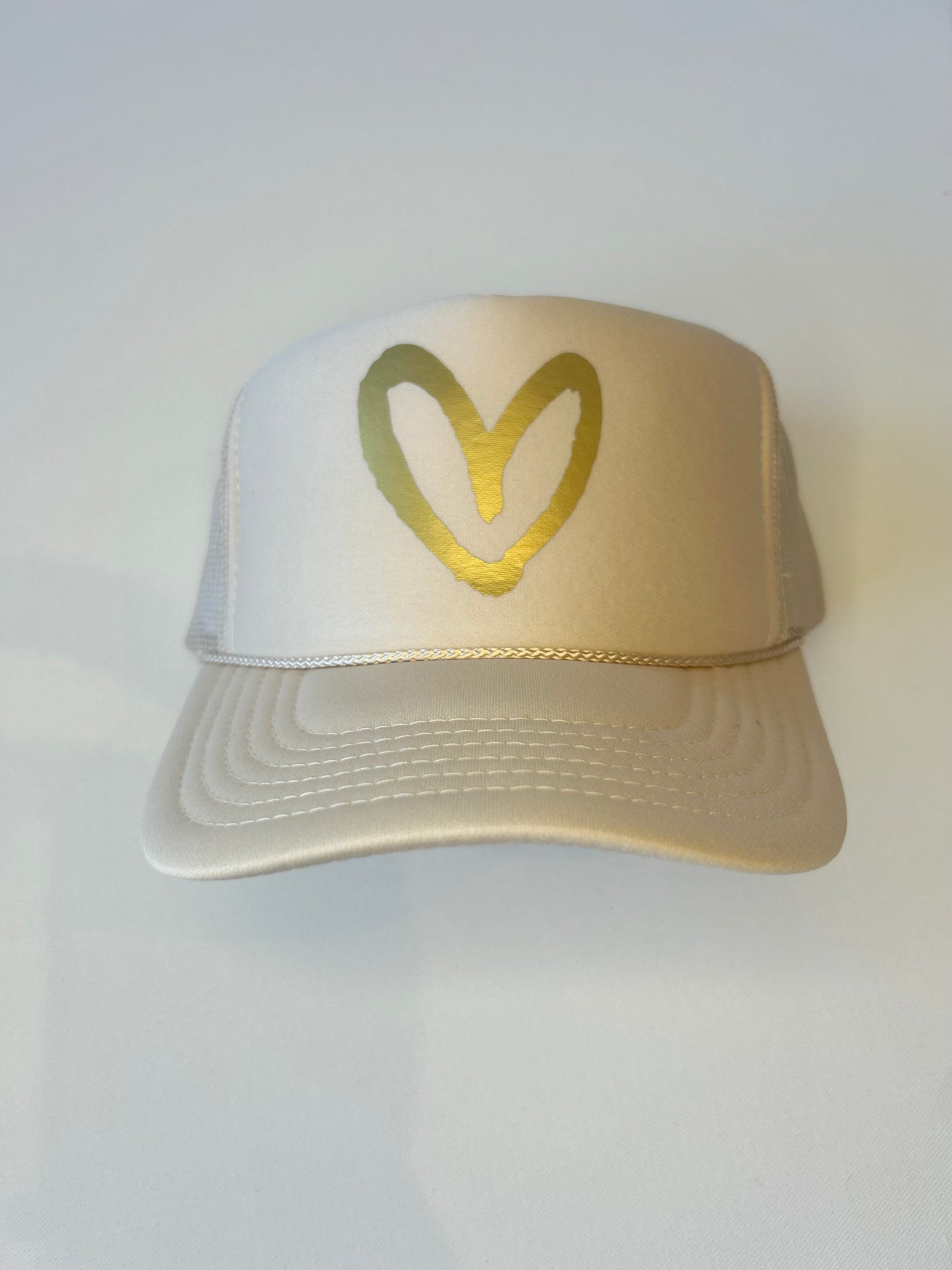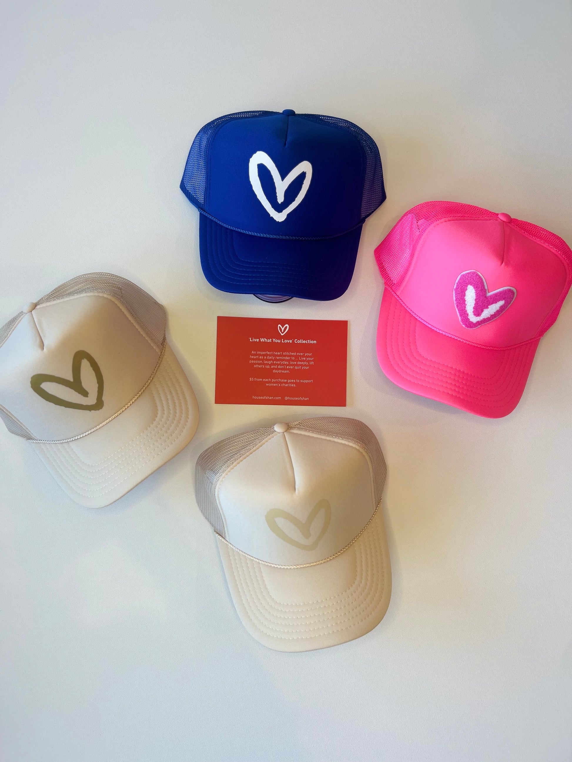 Live What You Love: Old school trucker hats with the rope across the brim + our Imperfect Heart to remind you and everyone around you to "Live What You Love" each and every day.